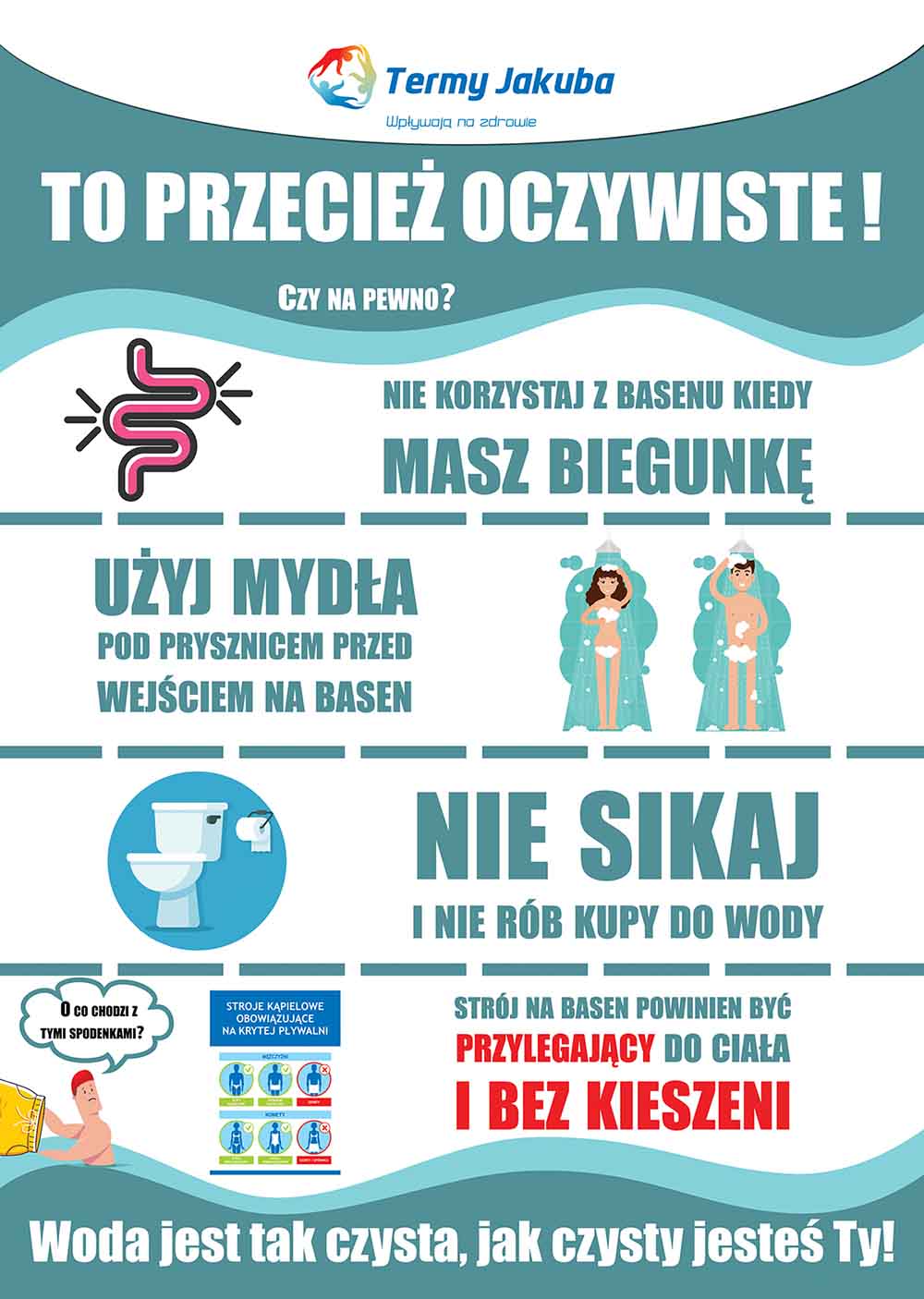- Wszyscy kąpiący się muszą nosić czyste stroje kąpielowe które są przylegające do ciała i bez kieszeni.